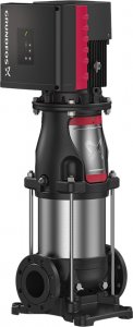 Vertical, multistage centrifugal pump with integrated frequency converter. The pump head and base are in cast iron — all other wetted parts are in stainless steel (EN 1.4301)