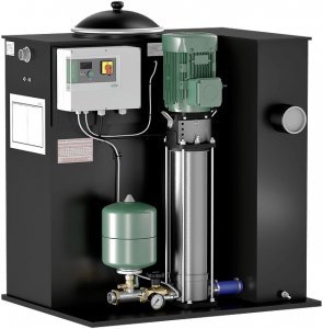 - Готовая к подключению установка для водоснабжения, смонтированная на фундаментной раме из полиэтилена, комплектная система трубопроводов, включая всю необходимую общую и запорную арматуру (за исключением запорной арматуры со стороны подвода), комплект датчиков давления, высоконапорный центробежный насос из нержавеющей стали в исполнении с сухим ротором (серия Helix V) и полностью смонтированный и готовый к подключению контроллер EC. Электронная система отключения для защиты от сухого хода встроена в устройство управления